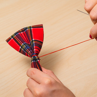 9. Thread your needle and tie a knot in the end so it's ready. The part can be quite fiddly so you might need to experiment a bit. Pinch the bow together with your thumb, index and middle fingers, and create a bow shape.